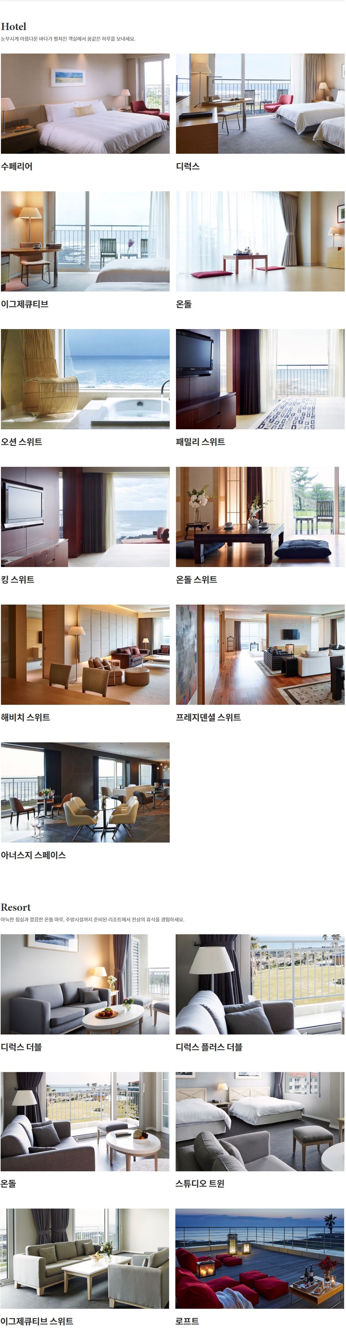 객실안내 : 호텔-디럭스, 호텔-스위트, 리조트 32평형, 리조트 49평형