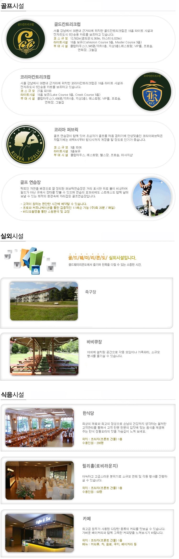 부대시설 : 골드CC, 코리아CC, 족구장, 바베큐장, 한식당, 카페, 글램핑장 등