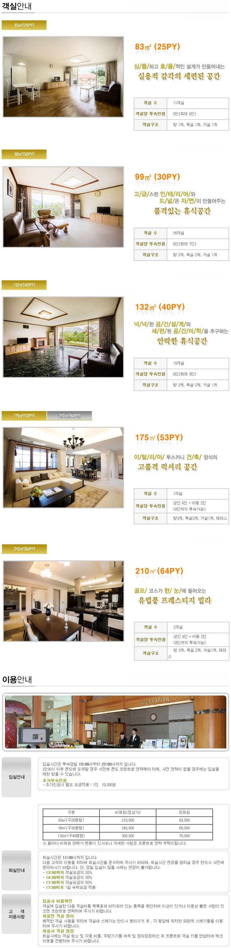 객실안내 : 25평형(11실), 30평형(35실), 40평형(15실), 53평형(1실), 64평형(2실)