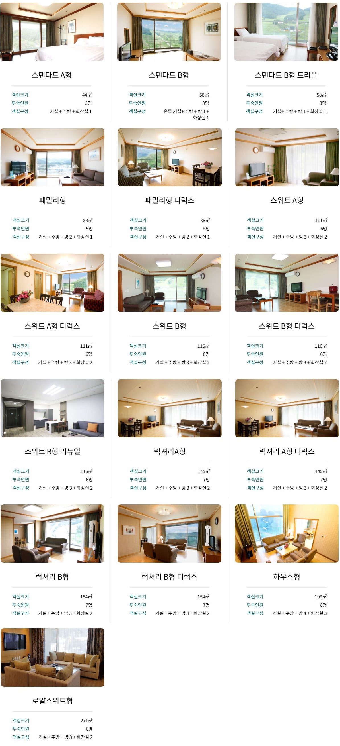 객실안내 : 스탠다드(13평, 18평), 패밀리(27평), 스위트(34평, 35평), 럭셔리(44평, 47평), 하우스(60평), 로얄스위트(82평),