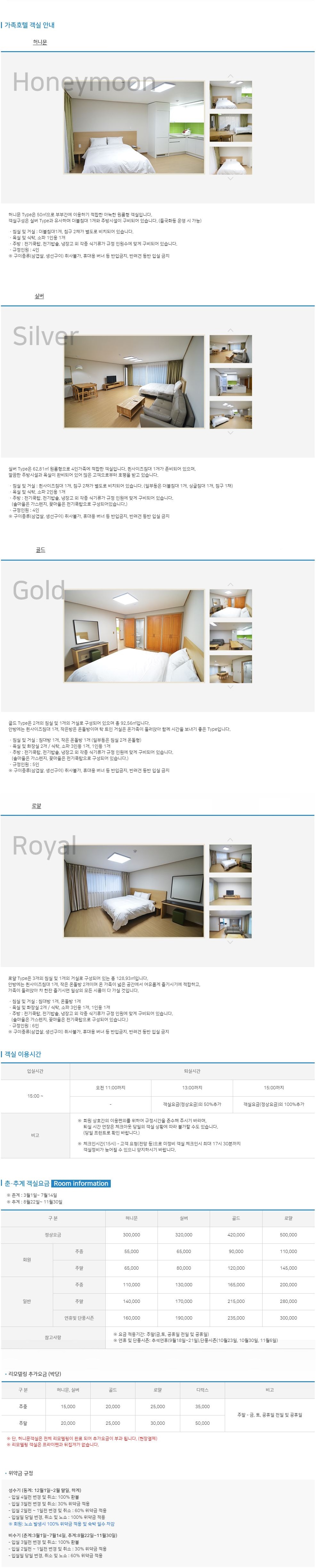 객실안내 : 허니문(15평), 실버(19평), 골드(28평), 로얄(39평)