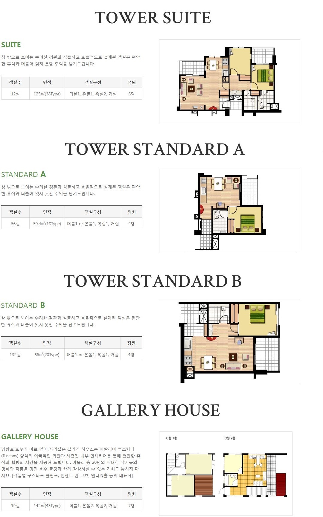 객실안내 : 타워스위트(38평), 스탠다드A(18평), 스탠다드B(20평), 갤러리하우스(42평)